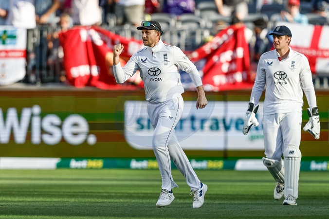 Joe Root of England celebrates England captain Ben Stokes taking his Sith wicket during the NRMA Insurance Ashes First Test Day 1 Series Australia vs England at Optus Stadium, Perth, Australia, 20th November 2025, Credit:Santanu Banik/News Images / Avalon