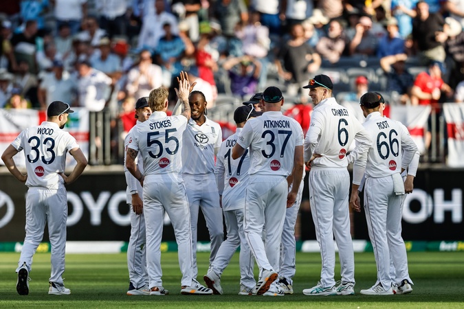 England captain Ben Stokes celebrates his 5th wicket of the session with Jofra Archer of England during the NRMA Insurance Ashes First Test Day 1 Series Australia vs England at Optus Stadium, Perth, Australia, 20th November 2025, Credit:Santanu Banik/News Images / Avalon