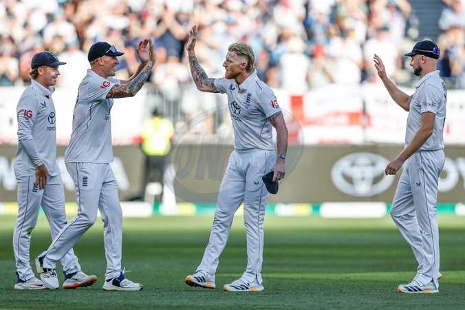 England captain Ben Stokes celebrates his fourth wicket with Brydon Carse of England during the NRMA Insurance Ashes First Test Day 1 Series Australia vs England at Optus Stadium, Perth, Australia, 20th November 2025, Credit:Santanu Banik/News Images / Avalon