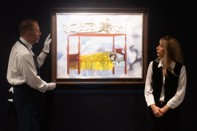 Art handlers hold 'El Sueño (La Cama)' (translation - The Dream - (The Bed)) by Frida Kahlo (est. $40m-$60m USD) at Sotheby's 'EXQUISITE CORPUS: Surrealist Treasures from a Private Collection' Auction on view from today 19th September 2025 - 23 September 2025 at Sotheby's, London, England, UK on Friday 19 September, 2025., Credit:Justin Ng / Avalon
