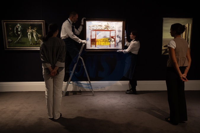 Art handlers hold 'El Sueño (La Cama)' (translation - The Dream - (The Bed)) by Frida Kahlo (est. $40m-$60m USD) at Sotheby's 'EXQUISITE CORPUS: Surrealist Treasures from a Private Collection' Auction on view from today 19th September 2025 - 23 September 2025 at Sotheby's, London, England, UK on Friday 19 September, 2025., Credit:Justin Ng / Avalon