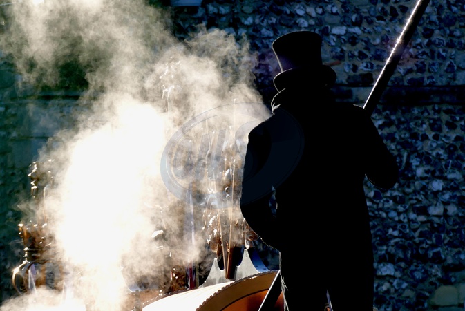 The Winchester Christmas market opened today. A mulled wine stirrer wearing a top hat stood high up on a platform to prepare the mulled wine to sell to visitors to the popular event in the grounds of Winchester Cathedral., Credit:Geoffrey Swaine / Avalon