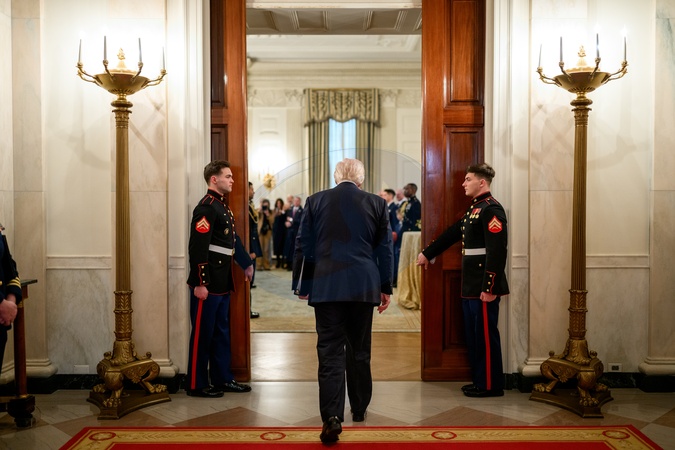 President Donald Trump enters the State Dining Room to deliver remarks to a group of recently freed Israeli hostages, Thursday, November 20, 2025., Credit:Molly Riley / Avalon