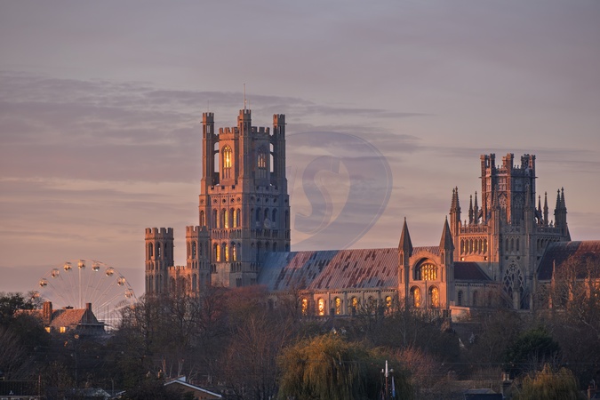 Ely Cathedral and sunset, with a large viewing wheel erected for the pre Christmas period. Ely, Cambridgeshire, UK.