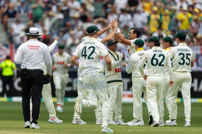 Mitch Starc of Australia is congratulated by his team mates after taking a wicket during the NRMA Insurance Ashes First Test Day 2 Australia vs England at Optus Stadium, Perth, Australia, 22nd November 2025, Credit:Santanu Banik/News Images / Avalon