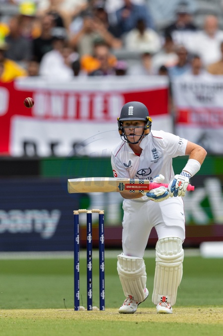 Ollie Pope of England plays a defensive shot during the NRMA Insurance Ashes First Test Day 2 Australia vs England at Optus Stadium, Perth, Australia, 22nd November 2025, Credit:Santanu Banik/News Images / Avalon