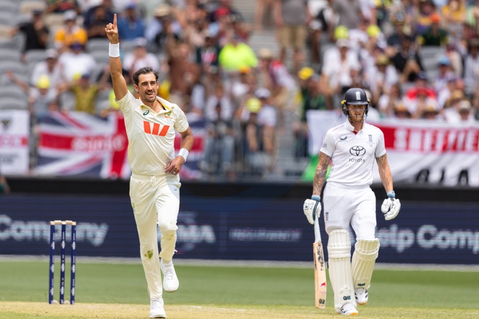 Mitch Starc of Australia celebrates after taking a wicket during the NRMA Insurance Ashes First Test Day 2 Australia vs England at Optus Stadium, Perth, Australia, 22nd November 2025, Credit:Santanu Banik/News Images / Avalon