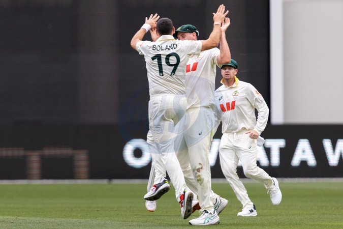 Scott Boland of Australia is congratulated by his team mates after taking a wicket during the NRMA Insurance Ashes First Test Day 2 Australia vs England at Optus Stadium, Perth, Australia, 22nd November 2025, Credit:Santanu Banik/News Images / Avalon