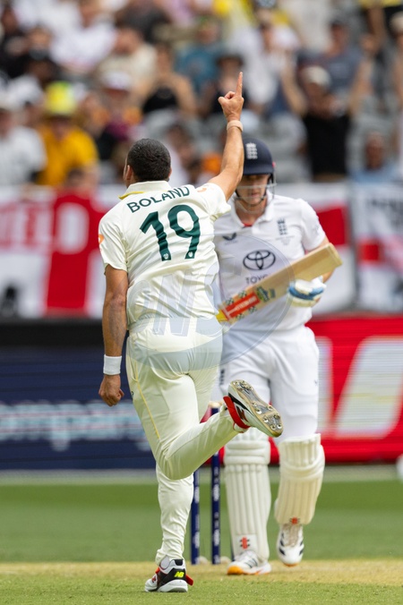 Scott Boland of Australia celebrates after taking a wicket during the NRMA Insurance Ashes First Test Day 2 Australia vs England at Optus Stadium, Perth, Australia, 22nd November 2025, Credit:Santanu Banik/News Images / Avalon