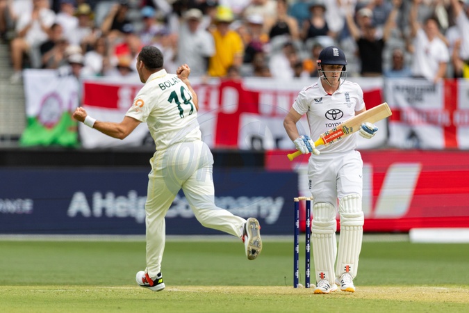 Scott Boland of Australia celebrates after taking a wicket during the NRMA Insurance Ashes First Test Day 2 Australia vs England at Optus Stadium, Perth, Australia, 22nd November 2025, Credit:Santanu Banik/News Images / Avalon