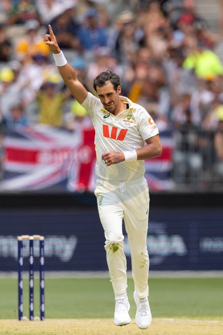 Mitch Starc of Australia celebrates after taking a wicket during the NRMA Insurance Ashes First Test Day 2 Australia vs England at Optus Stadium, Perth, Australia, 22nd November 2025, Credit:Santanu Banik/News Images / Avalon