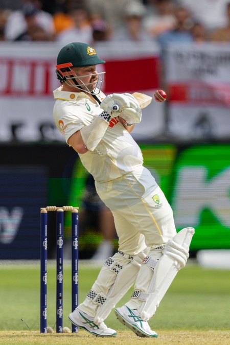 Travis Head of Australia hits a six by upper cut during the NRMA Insurance Ashes First Test Day 2 Australia vs England at Optus Stadium, Perth, Australia, 22nd November 2025, Credit:Santanu Banik/News Images / Avalon