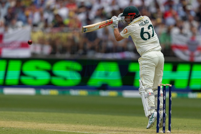 Travis Head of Australia drives the ball during the NRMA Insurance Ashes First Test Day 2 Australia vs England at Optus Stadium, Perth, Australia, 22nd November 2025, Credit:Santanu Banik/News Images / Avalon