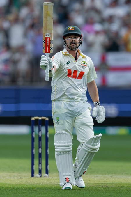 Travis Head of Australia raises bat after scoring a century during the NRMA Insurance Ashes First Test Day 2 Australia vs England at Optus Stadium, Perth, Australia, 22nd November 2025, Credit:Santanu Banik/News Images / Avalon