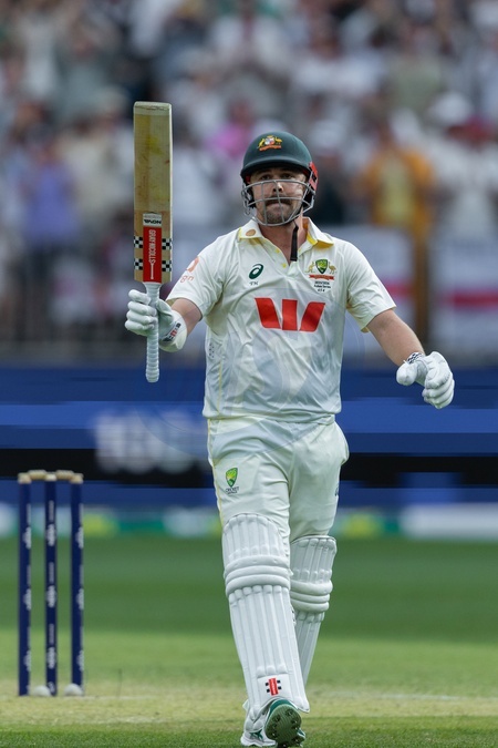 Travis Head of Australia raises bat after scoring a century during the NRMA Insurance Ashes First Test Day 2 Australia vs England at Optus Stadium, Perth, Australia, 22nd November 2025, Credit:Santanu Banik/News Images / Avalon