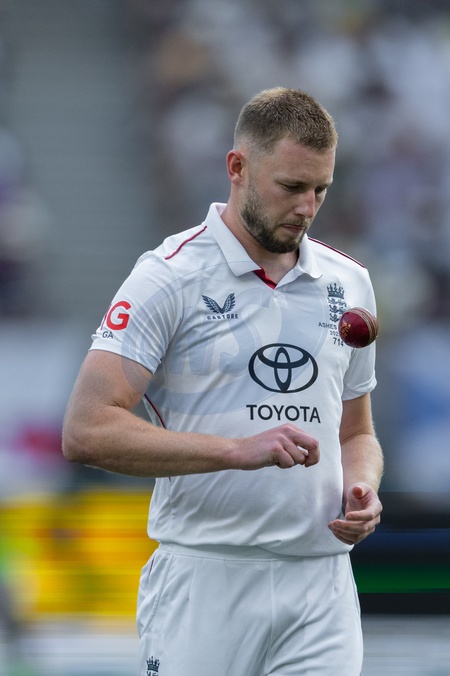Gus Atkinson of England in his run-up during the NRMA Insurance Ashes First Test Day 2 Australia vs England at Optus Stadium, Perth, Australia, 22nd November 2025, Credit:Santanu Banik/News Images / Avalon