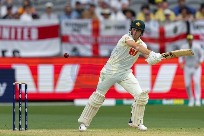 Marnus Labuschagne of Australia plays an attacking shot during the NRMA Insurance Ashes First Test Day 2 Australia vs England at Optus Stadium, Perth, Australia, 22nd November 2025, Credit:Santanu Banik/News Images / Avalon