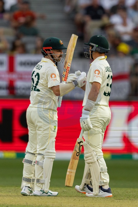 Travis Head and Marnus Labuschagne of Australia are seen bumping gloves during the NRMA Insurance Ashes First Test Day 2 Australia vs England at Optus Stadium, Perth, Australia, 22nd November 2025, Credit:Santanu Banik/News Images / Avalon