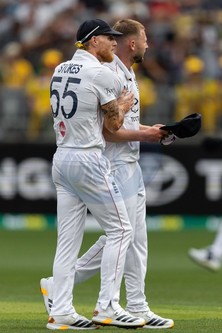 Ben Stokes is seen with Gus Atkinson of England during the NRMA Insurance Ashes First Test Day 2 Australia vs England at Optus Stadium, Perth, Australia, 22nd November 2025, Credit:Santanu Banik/News Images / Avalon