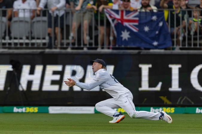 Ollie Pope of England takes a catch during the NRMA Insurance Ashes First Test Day 2 Australia vs England at Optus Stadium, Perth, Australia, 22nd November 2025, Credit:Santanu Banik/News Images / Avalon