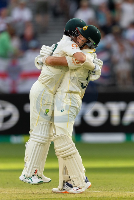 Travis Head of Australia is congratulated by his teammate for a brilliant innings after he got out during the NRMA Insurance Ashes First Test Day 2 Australia vs England at Optus Stadium, Perth, Australia, 22nd November 2025, Credit:Santanu Banik/News Images / Avalon