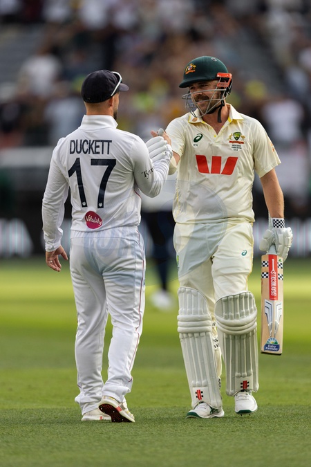 Travis Head of Australia is congratulated by Ben Duckett of England for a brilliant innings after he got out during the NRMA Insurance Ashes First Test Day 2 Australia vs England at Optus Stadium, Perth, Australia, 22nd November 2025, Credit:Santanu Banik/News Images / Avalon