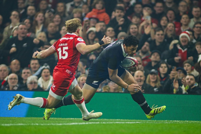 Caleb Clarke of New Zealand sores his teams first try during the Quilter Nations Series 2025 match Wales vs New Zealand at Principality Stadium, Cardiff, United Kingdom, 22nd November 2025, Credit:Andrew Lewis/News Images / Avalon