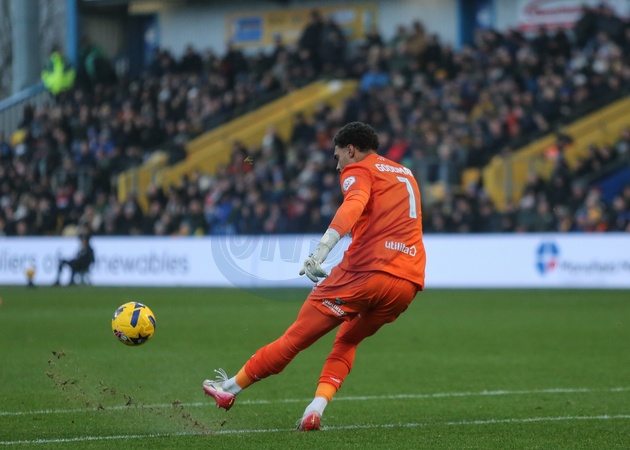 Huddersfield Town goalkeeper Owen Goodman passes the ball during the Sky Bet League 1 match Mansfield Town vs Huddersfield Town at One Call Stadium, Mansfield, United Kingdom, 22nd November 2025, Credit:Richard Bierton/News Images / Avalon