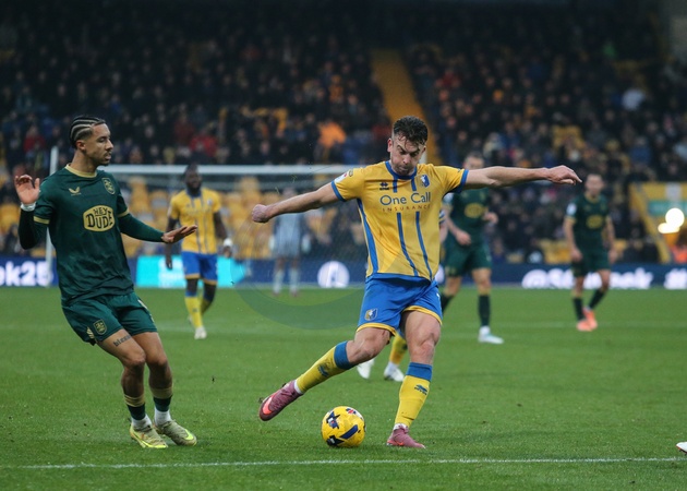 Rhys Oates of Mansfield Town has a shot on goal during the Sky Bet League 1 match Mansfield Town vs Huddersfield Town at One Call Stadium, Mansfield, United Kingdom, 22nd November 2025, Credit:Richard Bierton/News Images / Avalon