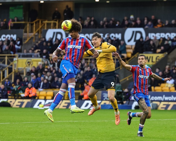 Chris Richards of Crystal Palace heads the ball clear of his defensive area under pressure from Jorgen Strand Larsen of Wolverhampton Wanderers during the Premier League match Wolverhampton Wanderers vs Crystal Palace at Molineux, Wolverhampton, United Kingdom, 22nd November 2025, Credit:Mark Cosgrove/News Images / Avalon