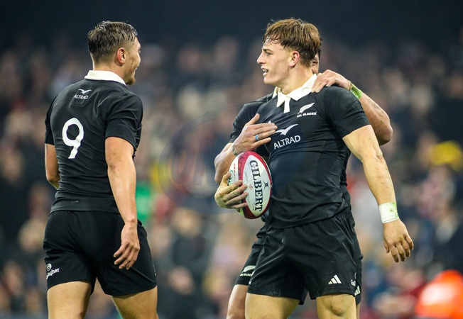 Ruben Love of New Zealand celebrates scoring a try with his teammates during the Quilter Nations Series 2025 match Wales vs New Zealand at Principality Stadium, Cardiff, United Kingdom, 22nd November 2025, Credit:Andrew Lewis/News Images / Avalon