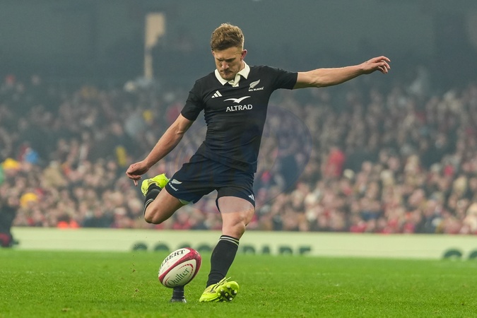 Damian McKenzie of New Zealand kicks a conversion during the Quilter Nations Series 2025 match Wales vs New Zealand at Principality Stadium, Cardiff, United Kingdom, 22nd November 2025, Credit:Andrew Lewis/News Images / Avalon