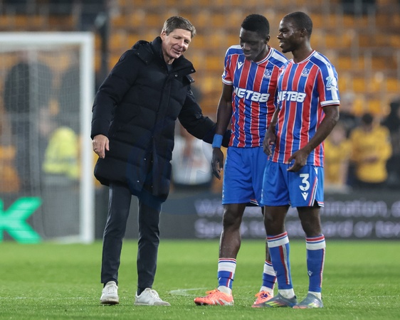 Oliver Glasner celebrates the win with Ismaila Sarr and Tyrick Mitchell of Crystal Palace during the Premier League match Wolverhampton Wanderers vs Crystal Palace at Molineux, Wolverhampton, United Kingdom, 22nd November 2025, Credit:Mark Cosgrove/News Images / Avalon