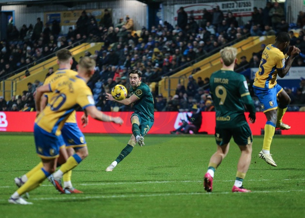 Antony Evans of Huddersfield Town has a shot on goal during the Sky Bet League 1 match Mansfield Town vs Huddersfield Town at One Call Stadium, Mansfield, United Kingdom, 22nd November 2025, Credit:Richard Bierton/News Images / Avalon