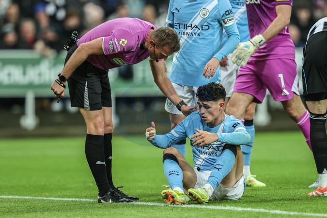 Referee Samuel Barrott checks on Phil Foden of Manchester City as he goes down injured during the Premier League match Newcastle United vs Manchester City at St. James's Park, Newcastle, United Kingdom, 21st November 2025, Credit:Ae Cosgrove/News Images / Avalon