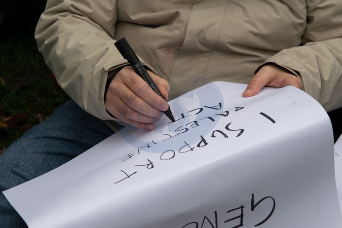 London, UK, 22nd November 2025 - Defend Our Juries protest in Tavistock Square as part of their "Lift The Ban" campaign, protestors openly expressed support for the proscribed organisation Palestine Action, by writing "I support Palestine Action" on placards and sitting on the floor, they were all arrested under the terrorism act en masse., Credit:Will Colebourne / Avalon