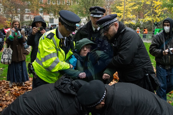 London, UK, 22nd November 2025 - Defend Our Juries protest in Tavistock Square as part of their "Lift The Ban" campaign, protestors openly expressed support for the proscribed organisation Palestine Action, by writing "I support Palestine Action" on placards and sitting on the floor, they were all arrested under the terrorism act en masse., Credit:Will Colebourne / Avalon