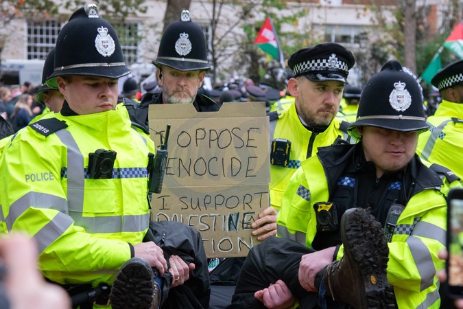 London, UK, 22nd November 2025 - Defend Our Juries protest in Tavistock Square as part of their "Lift The Ban" campaign, protestors openly expressed support for the proscribed organisation Palestine Action, by writing "I support Palestine Action" on placards and sitting on the floor, they were all arrested under the terrorism act en masse., Credit:Will Colebourne / Avalon