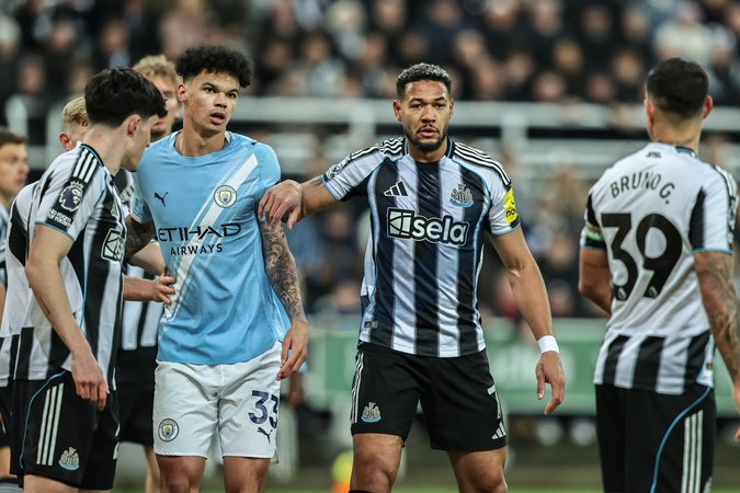 Joelinton of Newcastle Untied nudges Nico O'Reilly of Manchester City during the Premier League match Newcastle United vs Manchester City at St. James's Park, Newcastle, United Kingdom, 21st November 2025, Credit:Ae Cosgrove/News Images / Avalon
