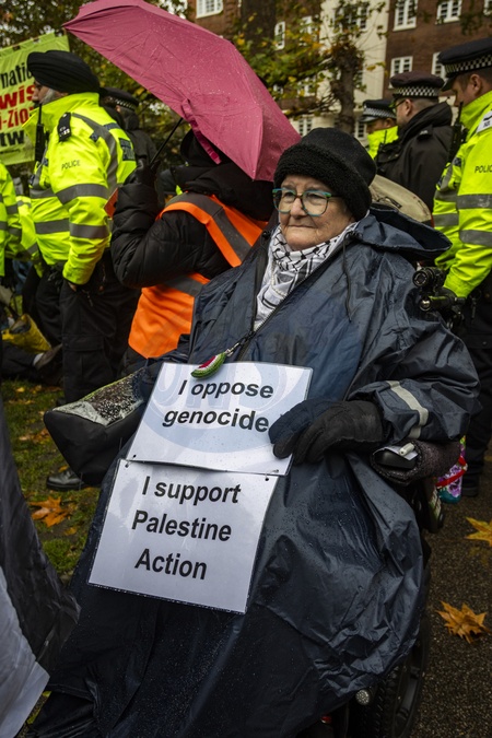 Defend Our Juries Support Protest for Palestine Action – London. A protest was held in Central London in support of the recently proscribed group Palestine Action. Demonstrators displayed banners and placards reading "I oppose genocide — I support Palestine Action” and condemned the government's decision to label the group as a terrorist organisation. The demonstration saw a significant police presence, with multiple protesters detained and taken away during the protest., Credit:Zak Irfan / Avalon