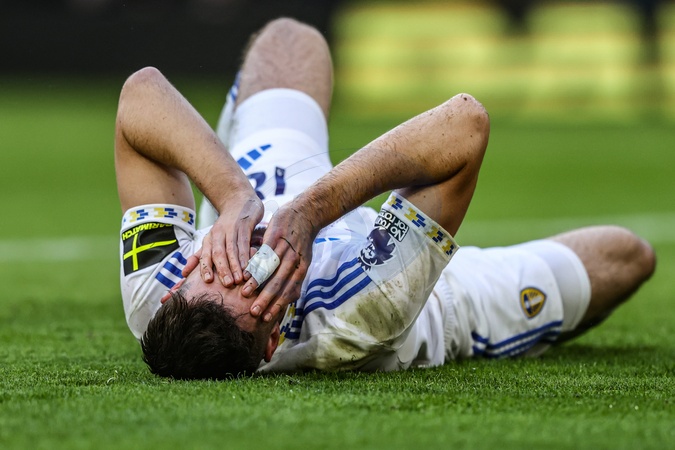 Anton Stach of Leeds United injured after heading the ball towards goal during the Premier League match Leeds United vs Aston Villa at Elland Road, Leeds, United Kingdom, 23rd November 2025, Credit:Ae Cosgrove/News Images / Avalon