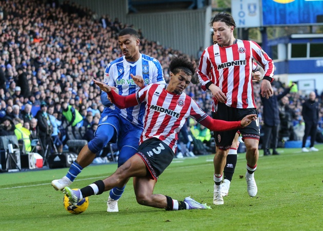 Sam McCallum of Sheffield United slide tackles Yan Valery of Sheffield Wednesday during the Sky Bet Championship match Sheffield Wednesday vs Sheffield United at Hillsborough, Sheffield, United Kingdom, 23rd November 2025, Credit:Richard Bierton/News Images / Avalon