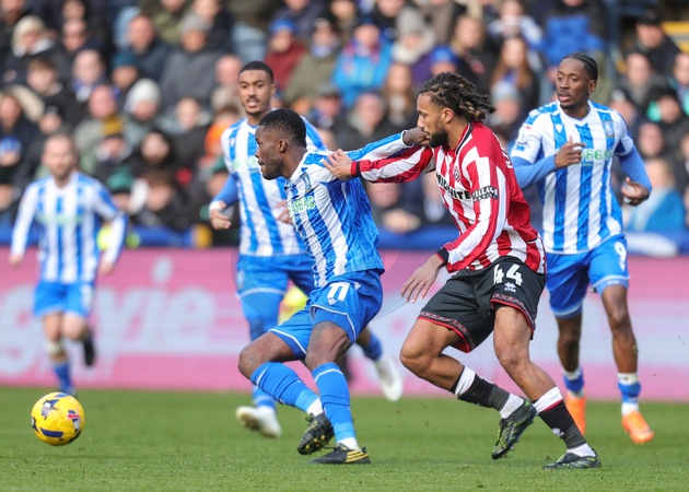 Ike Ugbo of Sheffield Wednesday holds off Jairo Riedewald of Sheffield United during the Sky Bet Championship match Sheffield Wednesday vs Sheffield United at Hillsborough, Sheffield, United Kingdom, 23rd November 2025, Credit:Richard Bierton/News Images / Avalon