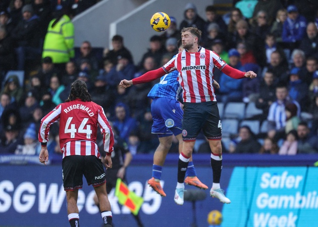 Patrick Bamford of Sheffield United jumps up to win the high ball during the Sky Bet Championship match Sheffield Wednesday vs Sheffield United at Hillsborough, Sheffield, United Kingdom, 23rd November 2025, Credit:Richard Bierton/News Images / Avalon