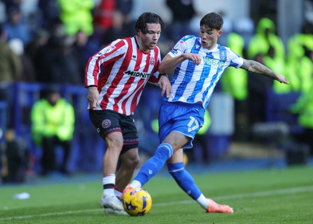 Charlie McNeill of Sheffield Wednesday puts a tackle in on Callum O'Hare of Sheffield United during the Sky Bet Championship match Sheffield Wednesday vs Sheffield United at Hillsborough, Sheffield, United Kingdom, 23rd November 2025, Credit:Richard Bierton/News Images / Avalon
