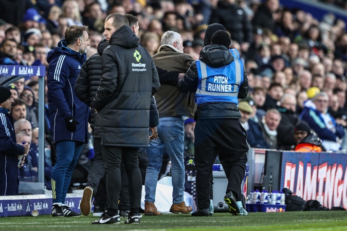 A fan is removed by security after walking onto the dugouts during the Premier League match Leeds United vs Aston Villa at Elland Road, Leeds, United Kingdom, 23rd November 2025, Credit:Ae Cosgrove/News Images / Avalon