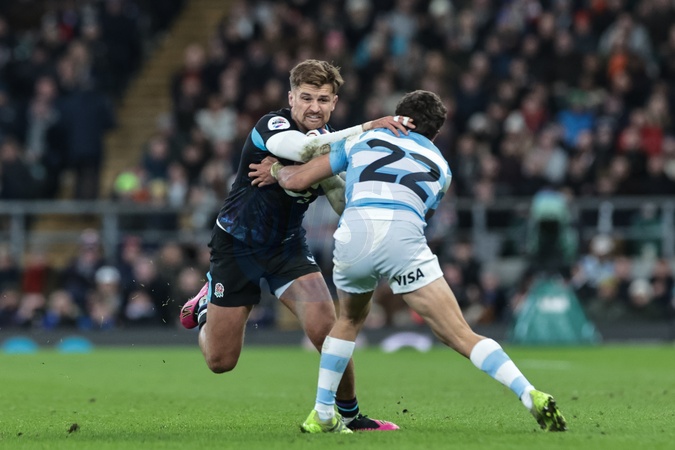 Henry Slade of England is tackled by Agustin Moyano of Argentina during the Quilter Nations Series 2025 match England vs Argentina at Allianz Stadium, Twickenham, United Kingdom, 23rd November 2025, Credit:Mark Cosgrove/News Images / Avalon