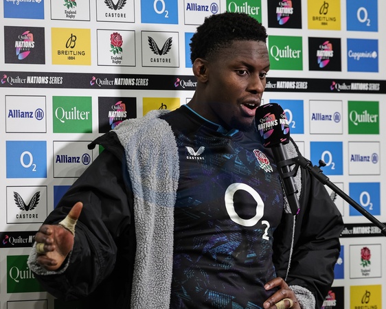 Mario Itoje of England during a live interview during the Quilter Nations Series 2025 match England vs Argentina at Allianz Stadium, Twickenham, United Kingdom, 23rd November 2025, Credit:Mark Cosgrove/News Images / Avalon