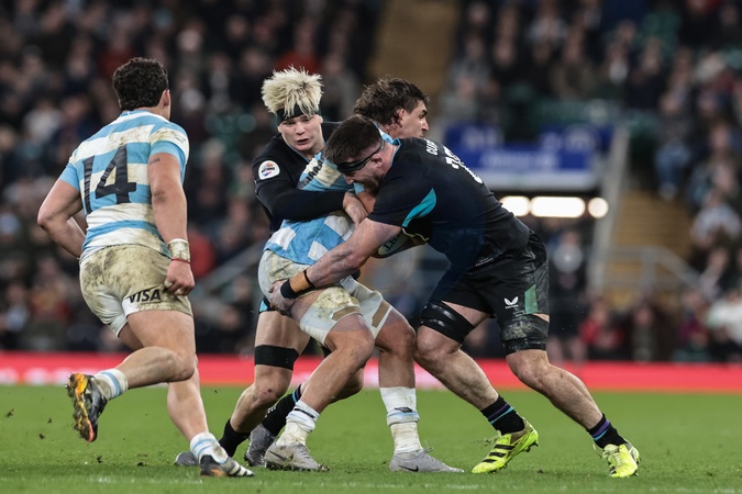Pablo Matera of Argentina is tackled by Henry Pollock of England and Alex Mitchel of England during the Quilter Nations Series 2025 match England vs Argentina at Allianz Stadium, Twickenham, United Kingdom, 23rd November 2025, Credit:Mark Cosgrove/News Images / Avalon