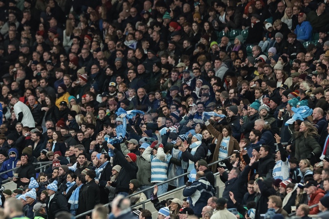 Argentina fans sing and dance late in the game as they make a comeback during the Quilter Nations Series 2025 match England vs Argentina at Allianz Stadium, Twickenham, United Kingdom, 23rd November 2025, Credit:Mark Cosgrove/News Images / Avalon
